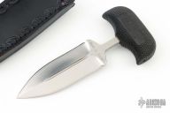 This Terminator Push Dagger by Cold Steel has a satin finished double edged blade with fullers and hidden tang, .186" blade stock, 1.324" depth. Handle is non-slip polymer. Excellent condition. Comes with a black leather sheath with clip. This was made in the 1980s