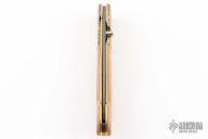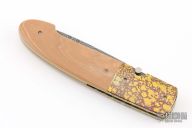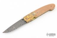 This liner-locking folder by Stan Fujisaka features a drop point Damascus drop point blade with a single thumb-stud. The handle has splash anodized titanium dovetailed bolsters, mammoth ivory scales, and anodized titanium liners and back-spacer. Marked 2009 inside the back-spacer. Comes with a soft pouch. Has a couple light scuffs, excellent condition.