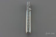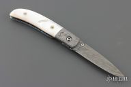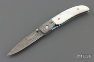 This linerlock folder by Joe Pardue features a Damascus blade with file worked spine and single thumbstud. The handle has Damascus bolsters, pearl scales, anodized and jeweled titanium liners, and a matching fileworked back-spacer. Nice detent, lock up and blade seating. Comes with a soft pouch. Excellent condition.