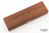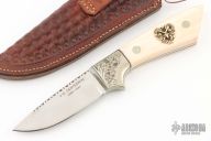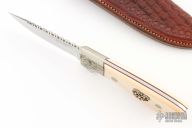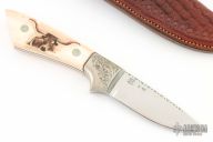 This knife by RD Nolen features a mirror polished drop point blade with fileworked spine, .132" blade stock and 1.194" blade depth, full tang construction. The handle has engraved and dovetailed nickel silver bolsters, mammoth ivory scales with scrimshaw of a long horn cow, a brass overlay on the other side, nickel silver pins and black liners. Comes with a hand tooled brown leather sheath and a wooden display box. Excellent Condition.  #66
