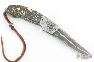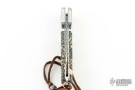 This Bolster Release Auto by Mike Whiskers Allen features a Damascus blade with fileworked spine. The handle has engraved dovetailed bolsters, fileworked stainless steel liners and backspacer. "Whisker 05-11" inside backspacer. Nice action, lockup and blade seating. Comes with felt pouch. Has a couple light scuffs, excellent condition otherwise.