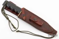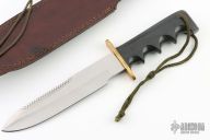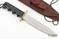 This Randall Style Fighter features a satin finished blade with sawteeth on the spine, .210" blade stock and 1.518" blade depth, hidden tang construction. The handle has a brass guard and black canvas micarta grip with lanyard hole. Comes with a brown leather sheath. Has some scratches on the blade and a little patina on the guard, otherwise excellent condition.