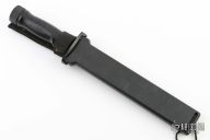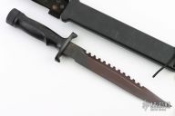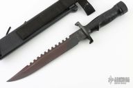 This Special Forces Survival II features a black blade with sawteeth on the spine, .155" blade stock and 1.301" blade depth, hollow handle construction. The handle is black composite with removable butt cap, survival items in the handle. Comes with a black composite sheath. The handle and the sheath have survival instructions and morse code all over. Has some light scratches, otherwise excellent condition for its age.