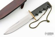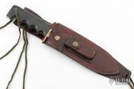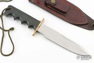 This Randall Style Fighter features a satin finished blade with sawteeth on the spine, .208" blade stock and 1.553" blade depth, hidden tang construction. The handle has a brass guard and black canvas micarta grip with lanyard hole. Comes with a brown leather sheath. Has some oxidation spots on the blade, otherwise good condition.