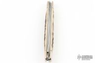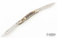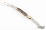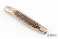 This slipjoint by AM Mayhall features a two mirror polished blades with nail nick. The handle has nickel silver bolsters, stag covers with an escutcheon, nickel silver liners and steel spring. Has some light scratches and patina, otherwise good condition.