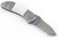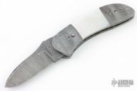 This custom Auto from Mike Vagnino features a Damascus blade with notched thumbrest. The handle has matching dovetailed Damascus bolsters, pearl scales, and jeweled titanium liners. Pearl inlaid release button. Nice detent, lockup, strong action and blade seating. Comes with a zipper case.