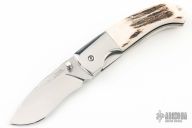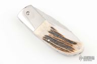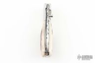 This linerlock by B Sharp features a mirror polished blade with fileworked spine with a single thumbstud. The handle has mirror polished stainless steel bolsters, stag scales with sterling silver pins, fileworked stainless steel liners and backspacer. Comes with a zippered case. Nice detent, lockup and blade seating. Has a couple light scratches, otherwise excellent condition.