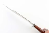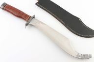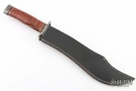 This knife by Ozair knives features a satin finished blade with false top edge and fileworked spine, .170" blade stock and 2.598" blade depth, hidden tang construction. The handle has a Damascus guard and butt, stacked leather grip with red/brass/buffalo horn spacers. Comes with original black leather sheath. Has some light scratches and patina, otherwise excellent condition.