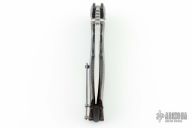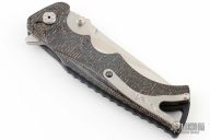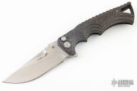 This Tighe Fighter from Brian Tighe features a hand rub satin finished drop point blade with swedge, dual thumb studs, notched thumbrest and flipper. The handle is comprised of a machined copper carbon fiber frame over a notched G-10 backspacer. Titanium tip up pocket clip with ceramic ball inset. Comes with zippered case. Has a couple light scuffs, excellent condition otherwise.