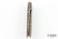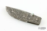 This linerlock folder by RB Johnson features a Damascus blade with a single thumbstud with pearl inlay. The handle has mosaic Damascus bolsters, Damascus scales, anodized titanium liners and a fileworked stainless steel backspacer. Nice detent, lockup and seating. Very nice work. Comes with a soft pouch. Has a couple light scuffs, otherwise excellent condition.