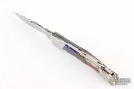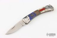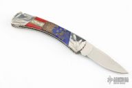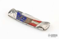 This Buck 505 has been Customized by Ghostown Knives. This one has a satin finished blade with fileworked spine and a nail nick. The handle has a stainless steel frame with engraved bolsters, fileworked edges and liners, fileworked stainless steel backspacer. Has patriotic theme inlays. Has a few light scratches, otherwise excellent condition. Comes with a zipper case. Has some light scuffs, and patina, excellent condition.