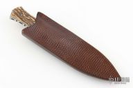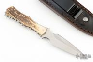 This stag boot dagger by Dick Dorough features a mirror polished double edge blade with .121" bladestock and .918" blade depth. Scales are stag. Full tang construction with copper pins. Comes with a leather sheath with ostrich panel, and metal clip. Has a couple light scuffs and scratches, otherwise excellent condition.