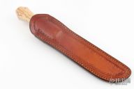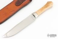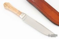 This Bowie by Jerry Langbein features a mirror finished blade with a false top edge, file worked blade spine, .189" blade stock and 1.343" blade depth, full tang construction. The handle has nickel silver dovetailed bolsters with mammoth scales with red liners. Comes with a hand tooled brown leather sheath with belt loop. Handle has a crack on the "B" side of the knife. Has a few light scratches, otherwise excellent condition.