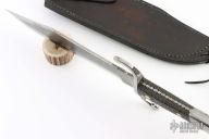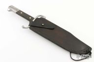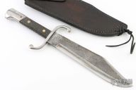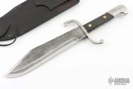 This Bowie by Pabu Knives features a clip point blade with notched thumbrest and false top edge, .169" blade stock and 1.901" blade depth, full tang construction. The handle has a steel S-Guard and butt, textured black scales. Comes with a black leather sheath. Has some scratches and patina, otherwise good condition. His makers mark is on the butt and is a little faint.