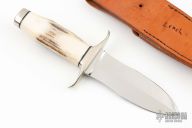 This Dagger by Milo Leach has a mirror polished double-edged recurve dagger with, .187" blade stock and 1.425" blade depth, hidden tang construction. The handle has a nickel silver guard and butt with stag grip and black spacers. Comes with a brown leather sheath with belt loop. Has a couple light sctatches and some patina, excellent condition otherwise.