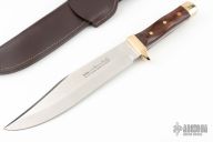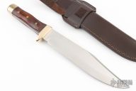 This Bowie by Linder features a satin finished blade with false top edge, .188" blade stock and 1.914" blade depth, full tang construction. The handle has a nickel silver guard and rear bolsters, cocobolo scales. Comes with original leather sheath. Has some light scratches, otherwise excellent condition.