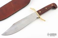 This W49 Bowie by Western Cutlery features a bowie blade with a false top edge, .168" blade stock and 2.094" blade depth, full tang construction. The handle has a brass s-guard, wood scales with brass pins. Comes with a brown leather sheath, but the snap is broken on the sheath. Has some scratches and patina, otherwise good condition.