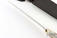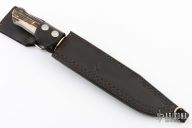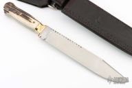 This Bowie by Fred George Millard features a nearly mirror polished blade with false top edge and fileworked spine, .179" blade stock and 1.657" blade depth, full tang construction. The handle has brass bolsters, stag scales with green liners. Blade is stamped #168 and dated 1996. Comes with a hand tooled black leather sheath. Has some light scratches, otherwise excellent condition.