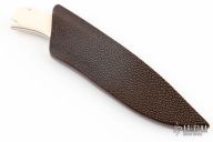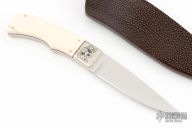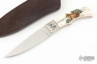 This Bird and Trout features a mirror polish drop point blade, engraved nickel silver bolsters, scrimshawed bone scales with red liners and nickel silver pins, .122" blade thickness and .758" blade depth, full tang construction. Has toothpick in the handle. Comes with a brown leather sheath with stingray panel. Has a couple light scuffs and scratches, excellent condition otherwise.
