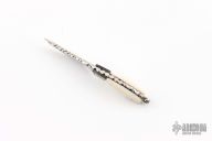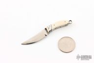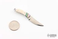 This Miniature Trailing Point Skinner is 2.375" long. It has a mirror polish finished blade with fileworked spine, .074" blade stock and .295" blade depth, full tang construction. Has abalone bolsters with pinned bone covers and lanyard (keychain) hole at the butt. Has some light scratches, excellent condition otherwise.
