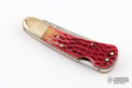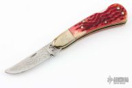 This Slipjoint by Carson features a Damascus upswept blade with nail nick. The handle is comprised of nickel silver bolsters and jigged bone scales over nickel liners and stainless steel rocker bar. Has some light scuffs and scratches, excellent condition otherwise.