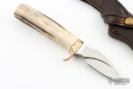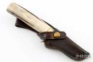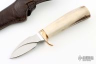 This knife by Bill Mains features a satin finished blade with .331" blade stock and 1.178" blade depth, hidden tang construction. The handle has a brass guard with a stag grip. Comes with a brown leather sheath. Excellent condition. There are no markings on this knife.