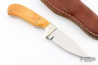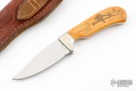 This Fixed Blade by Niemietz features a polished blade wth .131" blade stock and .968" blade depth, full tang construction. The handle has nickel silver bolsters and pins with scrimshawed Westinghouse paper micarta scales. Includes leather sheath with belt loop. Has some scratches, otherwise good condition.