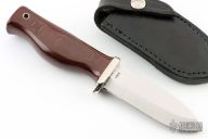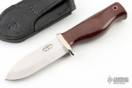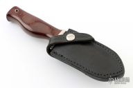 This knife by Martin Knives features a satin finished blade with notched thumbrest, .202" blade stock and 1.228" blade depth, full tang construction. The handle has a nickel silver guard, red linen micarta grip with a lanyard hole. Comes with black leather sheath. #07 on back of sheath. Excellent condition.