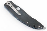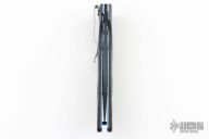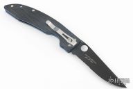 This AFCK Linerlock folder has a black spear point blade with partial serrations, thumb hole, and notched thumb rest. Handle is milled black G10 over titanium liners, anodized spacers, lanyard hole, and black stainless steel tip down clip. Comes with original box, papers, and drawstring pouch. Has some light scuffs, excellent condition otherwise.