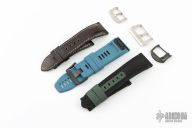 Two sets of Original 26mm Panerai watch straps. One set is leather, one set is canvas. Both say "Officine Panerai" inside the bands. Comes with aftermarket blue band set, and three buckles. Both show a little wear, excellent condition otherwise.