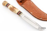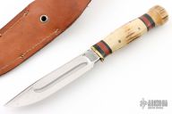 This Ideal Hunter by Marbles was made in Gladstone Michigan. It features a satin finished blade with fullers, .155" blade stock, .972" blade depth, hidden tang construction. The handle has a brass guard, stag grip, stag pommel, black/brass/red spacers. Has some pitting and scratches, has some separation in the stag grip, otherwise good condition for its age. Comes with a brown leather sheath