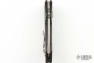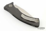 This Amphibian Auto has a stonewashed clip point recurve blade. Handle is black aluminum with nonslip inserts and bead blasted stainless steel tip up clip. S/N #0459 . Dated 01/2002. Includes a original box, papers and nylon sheath. Excellent Condition.
