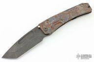 This Slim Midi Marauder from Medford Knife and Tool features an acid distressed drop point tanto blade with thumb stud and fullers. The handle is comprised of a "scorched earth" anodized titanium frame with tip up clip. Excellent detent, lockup, and seating. Comes with original box, hard case and COA dated Nov 15, 2023. Excellent condition.