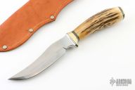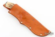 This knife features a satin finished blade with integral guard, .285" blade stock and 1.287" blade depth, hidden tang construction. The handle has a brass guard, stag grip, white/black spacers, and a brass butt. Comes with a brown leather sheath. Has some scratches and light oxidation spots, otherwise good condition.