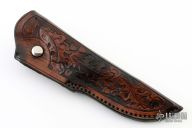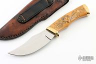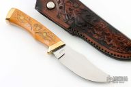 This knife by Dan Woods features a satin finished blade with .192" blade stock and 1.459" blade depth, full tapered tang construction. The handle has a brass guard and butt, Westinghouse paper micarta scales with scrimshaw. Comes with a hand tooled brown leather sheath. Has some light scratches, has been resharpened, otherwise good condition.