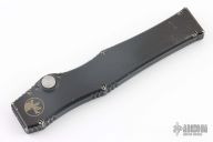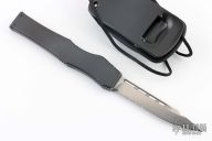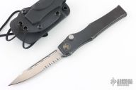 This HALO II is the clip point blade model in the HALO series by Microtech Knives. Single action, side positioned button for firing. Closure via a reverse charging handle in the rear of the frame. Contoured frame grip with milled ribbing on the frame spine and belly. This Halo II has a satin finished clip point blade dated 012/2006 #02824. Comes with a Microtech box and Kydex sheath. Has scuffs and scratches, good condition otherwise.
