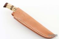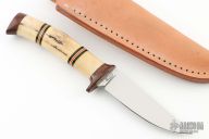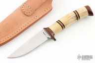 This Hunter by RW Wilson features a mirror finished drop point blade, .128" blade stock and .990" blade depth, hidden tang construction. The handle has a brown canvas micarta guard, stag grip, yellow/black/red spacers, brown canvas micarta butt. Comes with a brown leather sheath. Excellent condition. Stamped on ricasso "18 9 87"