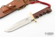 This fighter from Martin Knives features a satin finish clip point blade with sharpened top edge, .211" blade stock and 1.488" blade depth, full tang construction. The handle has a brass guard, brown canvas micarta handle with lanyard hole in pommel. Includes a brown leather sheath with a stone. Excellent condition.   Dated 07 under ricasso and on the sheath.