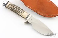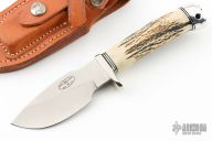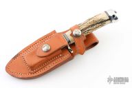 This knife by Martin Knives features a satin finished drop point blade with notched thumbrest, .202" blade stock and 1.445" blade depth, hidden tang construction. The handle has a nickel silver guard, stag grip with black /aluminum spacers, aluminum butt with lanyard hole. Comes with brown leather sheath. Dated 07 under ricasso and on sheath. Excellent condition.