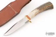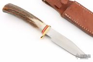 This knife by Ed Martin features a satin finished blade with false top edge, .171" blade stock and .955" blade depth, hidden tang construction. The handle has a brass guard, stag grip with orange/black spacers. Comes with brown leather sheath. Has some light scratches on the blade, otherwise excellent condition.