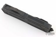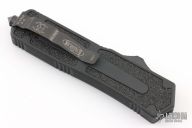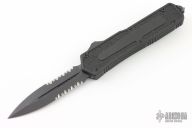 This Scarab OTF auto by Microtech has a black blade with fullers. The handle is black aluminum with all black fittings, single glass breaker, tip down black stainless steel clip. #0991 Dated 04/2005. Includes original sheath, paperwork, and box. Excellent Condition.