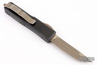 This UTX-85 by Microtech features a bronzed and stonewashed tanto blade with fullers. The handle has a black aluminum frame with bronzed hardware and tip down clip. S/N 61778 dated 05/2022. Has scuffs and scratches, great condition otherwise.