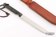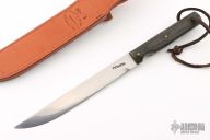 This Model 10 Salt Fisherman and Household Utility features a satin finished blade with notched thumbrest, .105" blade stock and .827" blade depth, full tang construction. The handle has black linen micarta scales with brass pins. Brass lanyard tube with lanyard in pommel. Includes a brown leather sheath and a zippered case. Excellent condition.