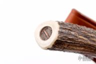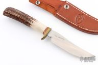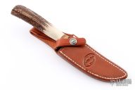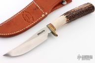 The RKS2 by Randall Made Knives features a stainless steel clip point blade with .168" blade stock and 1.032" blade depth, hidden tang construction. The handle has a brass guard with a stag grip. The RKS2 is the second club knife made by Randall Knives for the Randall Knife Society and was first offered in 1995. The blade is etched "RKS 042/1658". There is a 9/16" (compass size) Randall Knife Society club medallion in the butt of the handle. Comes with original brown leather sheath and a Randall zippered case. Excellent condition.