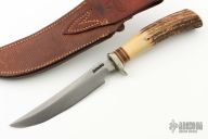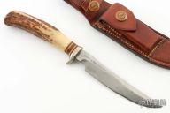 This Model 7-5 by Randall Made Knives features a satin finished upswept blade with false top edge, .164" stock and .874" blade depth, hidden tang construction. The handle has a nickel silver guard with red/white/blue spacers (8 spacers) and a pinned stag handle. Comes with brown leather HH Heiser sheath with brown buttons and a stone. Comes with zippered case. Has been hand sanded, has some light spotting, has some scratches. Good condition for its age. Back of blade reads "Bert H. Walling, SR."