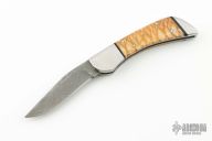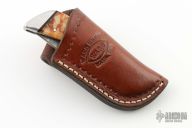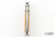 This Bolster Release Auto by Tommy Ware features a Damascus blade. The handle has satin finished stainless steel front and rear bolsters, stainless liners and fileworked backspacer with coral scales. Comes with a brown leather belt sheath.  Has a little blade play. Dated 1998. Has a few light scratches, otherwise excellent condition.