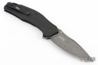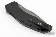 This 0357 by Zero Tolerance has a black stonewashed blade with notched thumbrest and flipper. The ZT 0357 is a premium knife designed for long, hard use. It's got a textured G-10 handle that allows a secure grip, and a long, broad CPM-20CV blade that is tough and will hold its edge. It runs on patented SpeedSafe assisted opening technology, so it will open every time without fail. S/N 9271. Comes with original box and paper. Excellent condition.