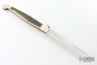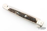 This Sicilian Ring Pull Stiletto from AGA Campolin features a tumbled bayonet ground blade. The handle has a nickel silver bolsters and ring-pull with stag scales over brass liners and stainless steel backspacer. Has some light scuffs and scratches, excellent condition otherwise.
