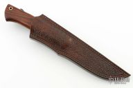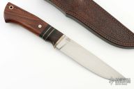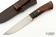 This custom hunter by Pavel Murnikov features a hand rub satin finished drop point blade with .158" blade stock and 1.239" blade depth, hidden tang construction. The handle has a satin finished nickel silver guard, ironwood grip with brass/black spacers. Comes with a hand tooled brown leather sheath and original wood box. New from maker! Very clean! Very Classy!