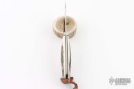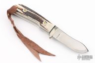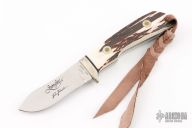 This knife by Junglee was designed by Tak Fukuta, it features a mirror polished blade with .107" blade stock and .841" blade depth, full tapered tang construction. The handle has a nickel silver guard and stag scales with black liners. Has some light scuffs and scratches, excellent condition otherwise.